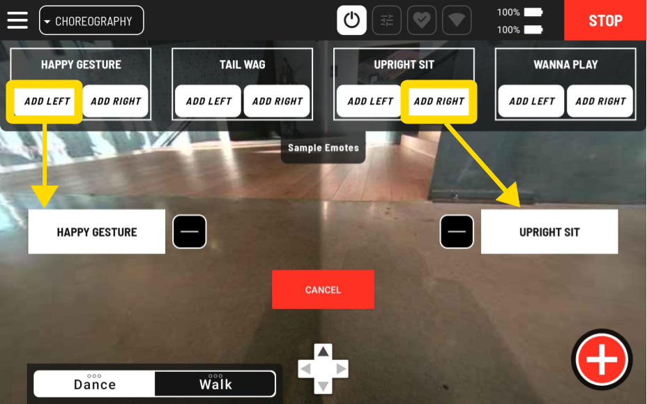 Add Sequence buttons to the screen - Lists of the choreography sequences that the robot can perform are viewable by pressing the tabs at the top of the screen. You can choose to place any sequence to the left or right side of the tablet screen, where it will be added to a list of buttons which each trigger the playback of the selected choreography sequence.