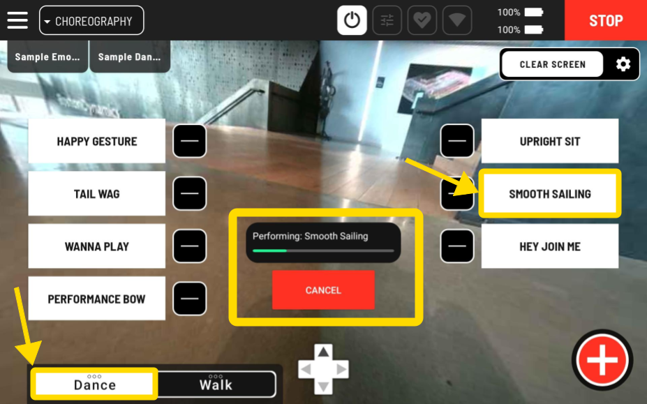 Stop a choreography sequence that is playing by pressing CANCEL in the center of the screen. If a sequence is canceled while it is playing, the robot will stop the sequence and attempt to freeze in place.